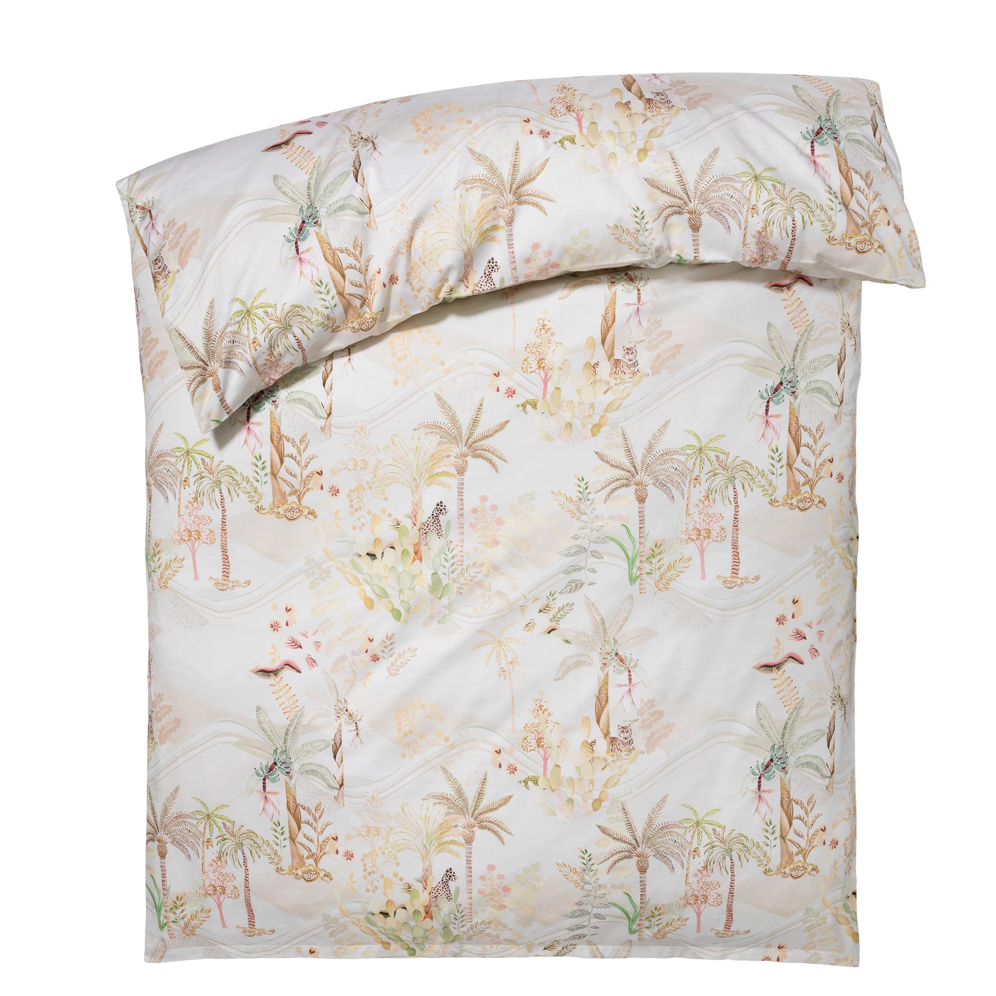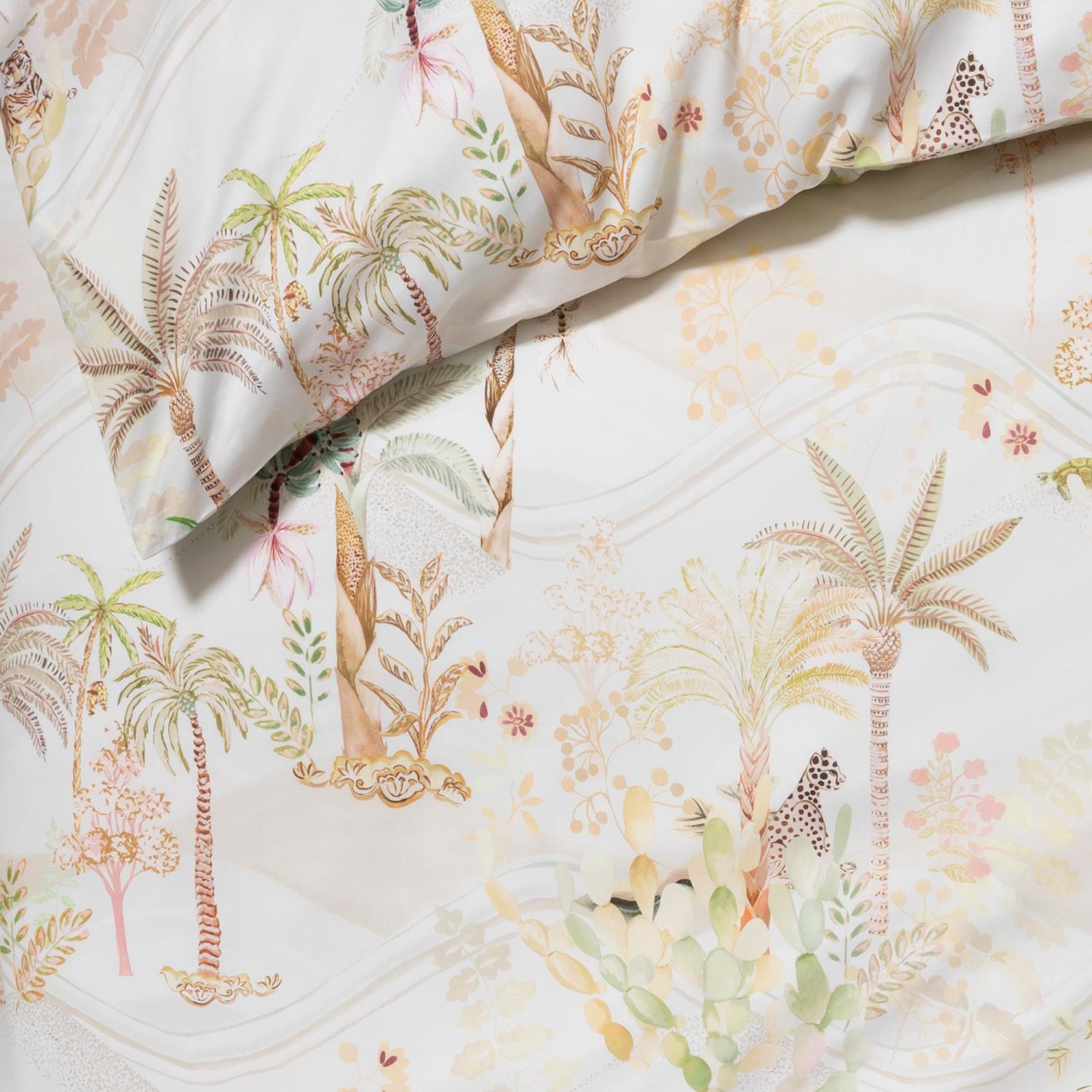 Der Bettbezug "Oasis" entführt in eine bezaubernde Wüstenlandschaft mit sanft wiegenden Palmen, Sukkulenten und stilisierten Blättern. Ein ruhender Tiger und ein getupfter Leopard verleihen der Szene eine majestätische Kraft, welche die Zeit stillstehen lässt. Die sanften Farbnuancen und die feinen Details schaffen eine harmonische Verbindung von Natur und Luxus und verleihen das beruhigende Gefühl einer Oase.