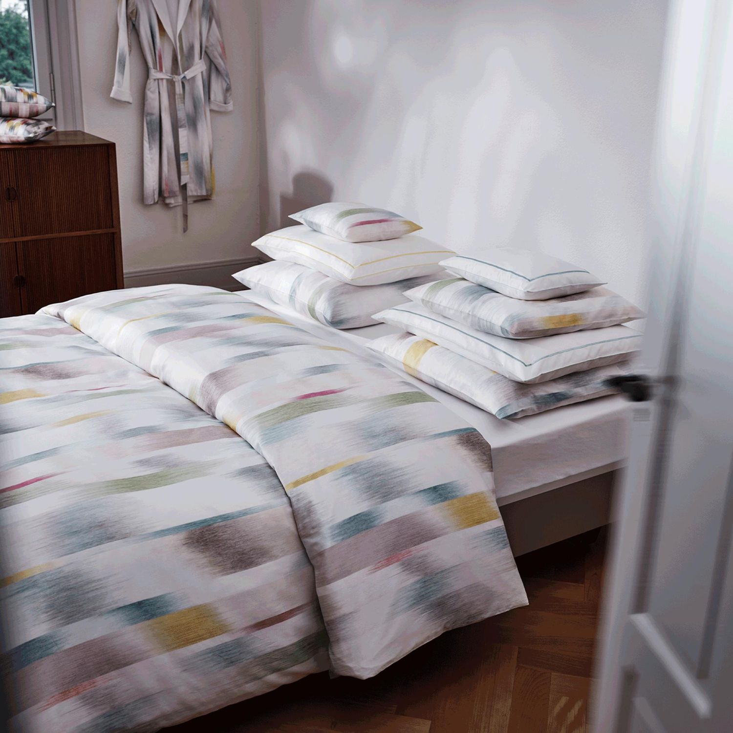 Das Motiv des Kissenbezuges "Motion" von Christian Fischbacher ist die künstlerische Interpretation eines Kettdrucks. Bei dieser Technik wird das Design vor dem Weben auf die Kettfäden gedruckt und erzeugt ein verschwommenes, fast aquarellartiges Muster. Die weichen Grau- und bunten Pastelltöne passen sowohl in klassische als auch in moderne Räume und verleihen eine elegante und gleichzeitig entspannende Atmosphäre.