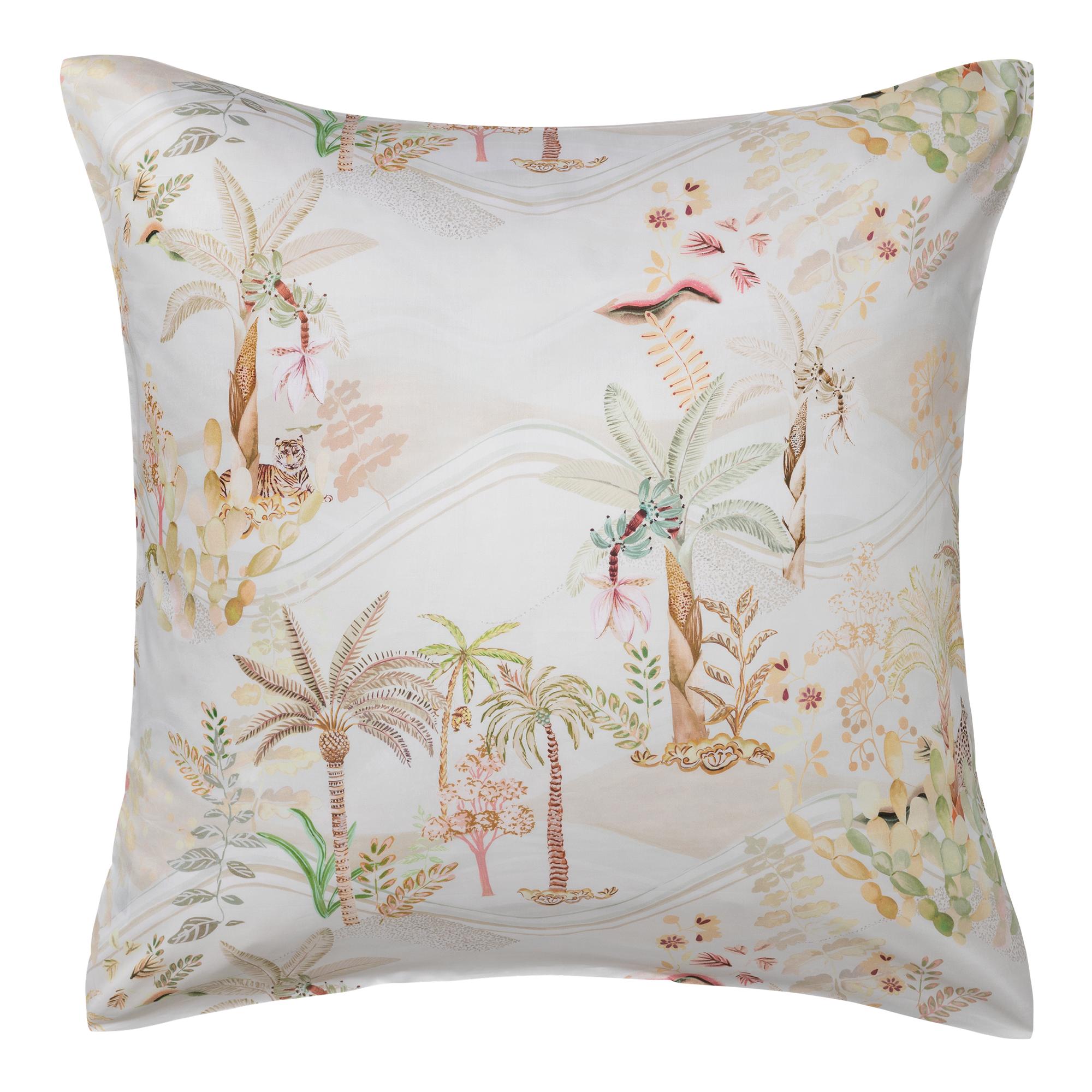 Der Kissenbezug "Oasis" entführt in eine bezaubernde Wüstenlandschaft mit sanft wiegenden Palmen, Sukkulenten und stilisierten Blättern. Ein ruhender Tiger und ein getupfter Leopard verleihen der Szene eine majestätische Kraft, welche die Zeit stillstehen lässt. Die sanften Farbnuancen und die feinen Details schaffen eine harmonische Verbindung von Natur und Luxus und verleihen das beruhigende Gefühl einer Oase.