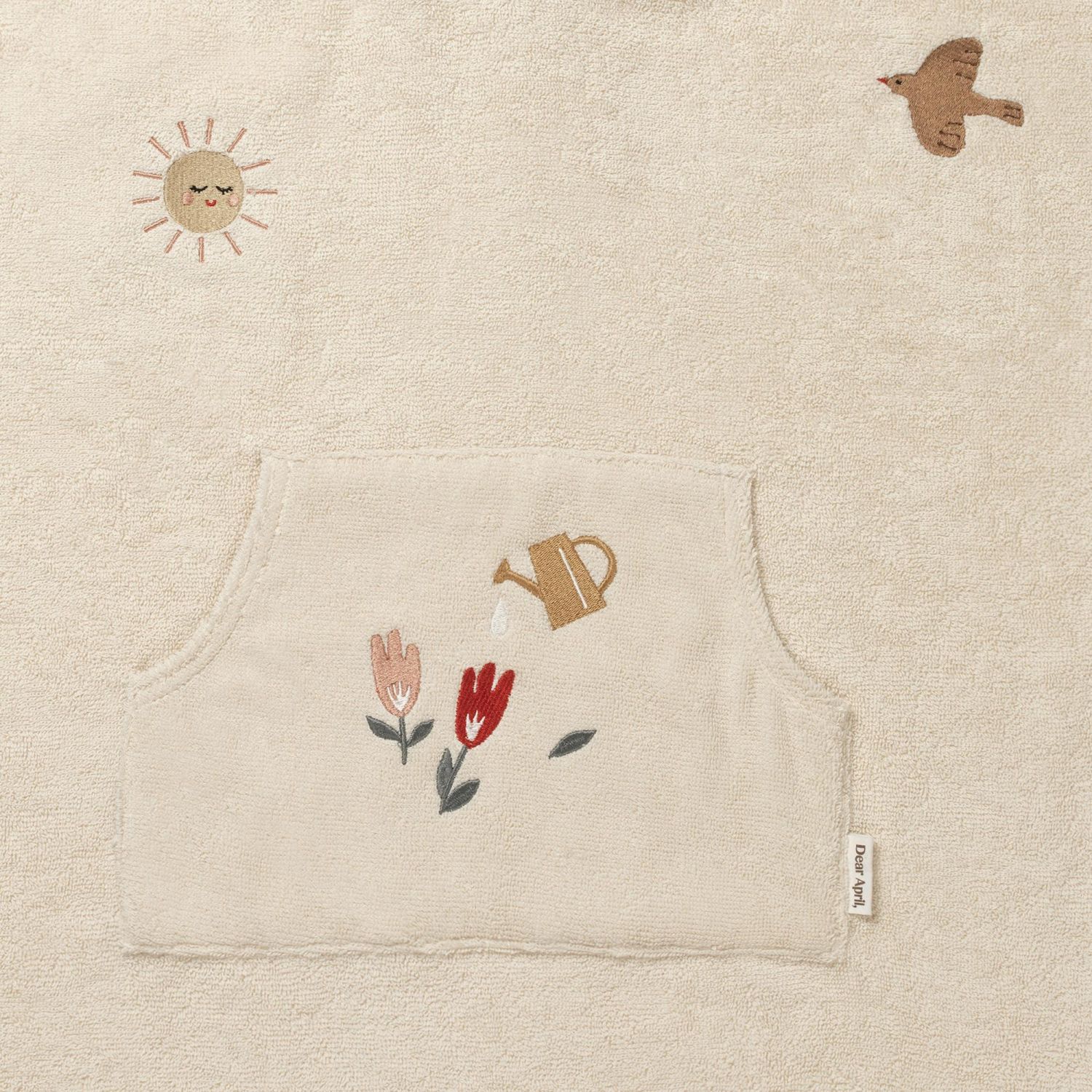 Der Kinder-Badeponcho "Harmoney" von Dear April. Verwöhnt Ihr Kind mit kuscheligem Komfort: Dieser Badeponcho aus dickem, weichem Frottee hält nach dem Baden oder Planschen angenehm warm. Dank der praktischen Kapuze ist Ihr Kind gut geschützt, und in der großen Kängurutasche lassen sich kleine Schätze verstauen oder die Hände wärmen. Liebevolle Stickereien, inspiriert von Natur und Abenteuer, machen den Poncho zu einem Lieblingsstück für kleine Entdecker.