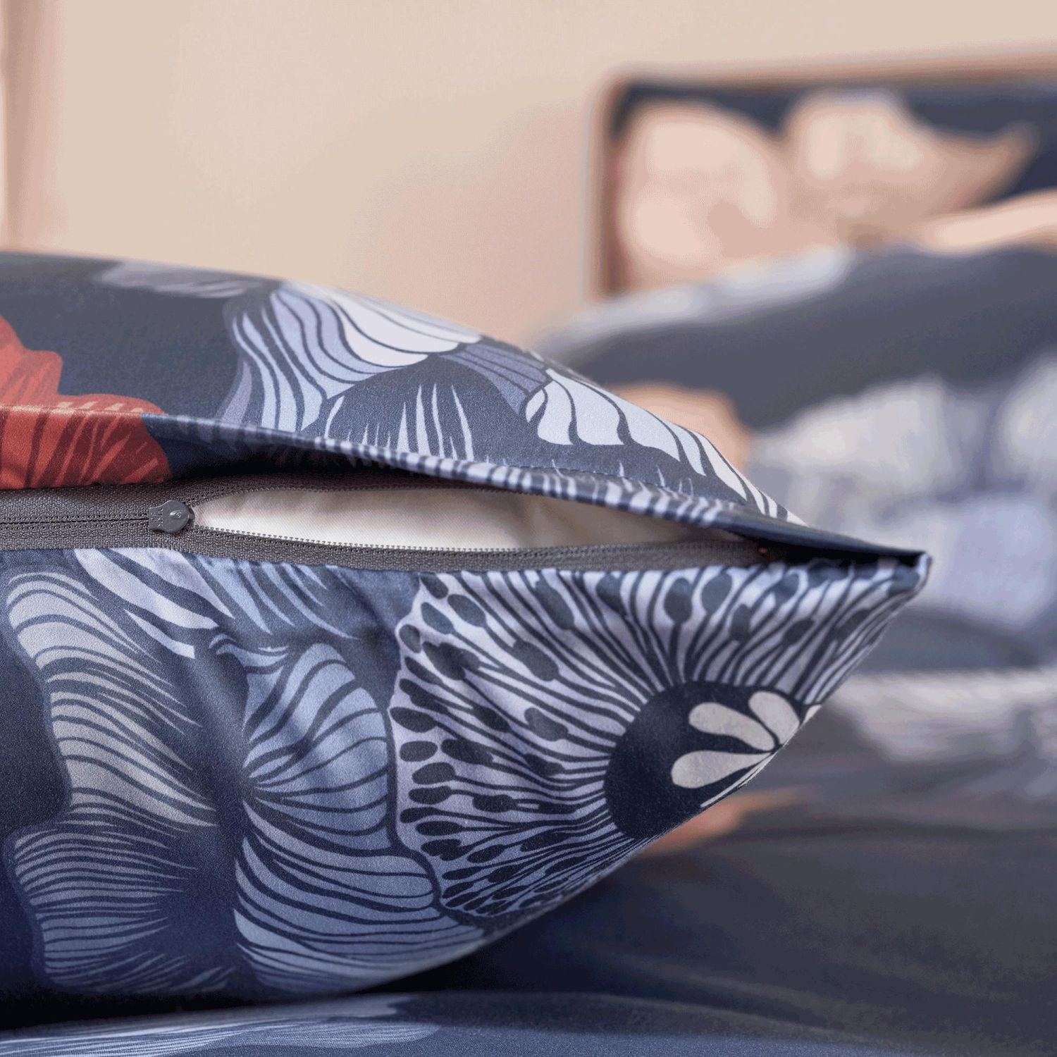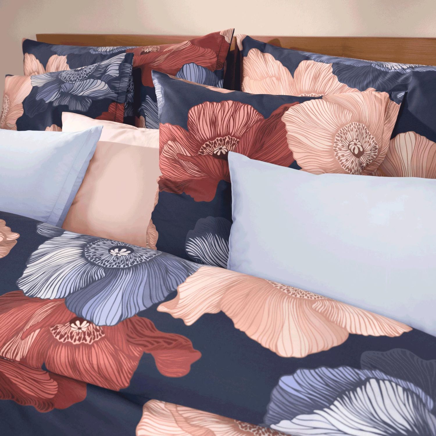 Der Kissenbezug "Mona" Noblesse von Schlossberg überzeugt mit einem gr0ßflächigen Blumenmotiv: Mohnblüten fächern ihre Blütenblätter wohlwollend auf und offenbaren damit ihre vielschichtigen, filigranen Blattadern sowie das typische, markante Blütenzentrum. Genau so einzigartig wie jede Mohnblüte ist auch die Handwerkskunst dieses handgemalten Bettwäsche-Designs. Eine intensive Farbgebung und eine hochwertige Satin Qualität machen "Mona" zu einem Klassiker für Ihr Schlafzimmer.